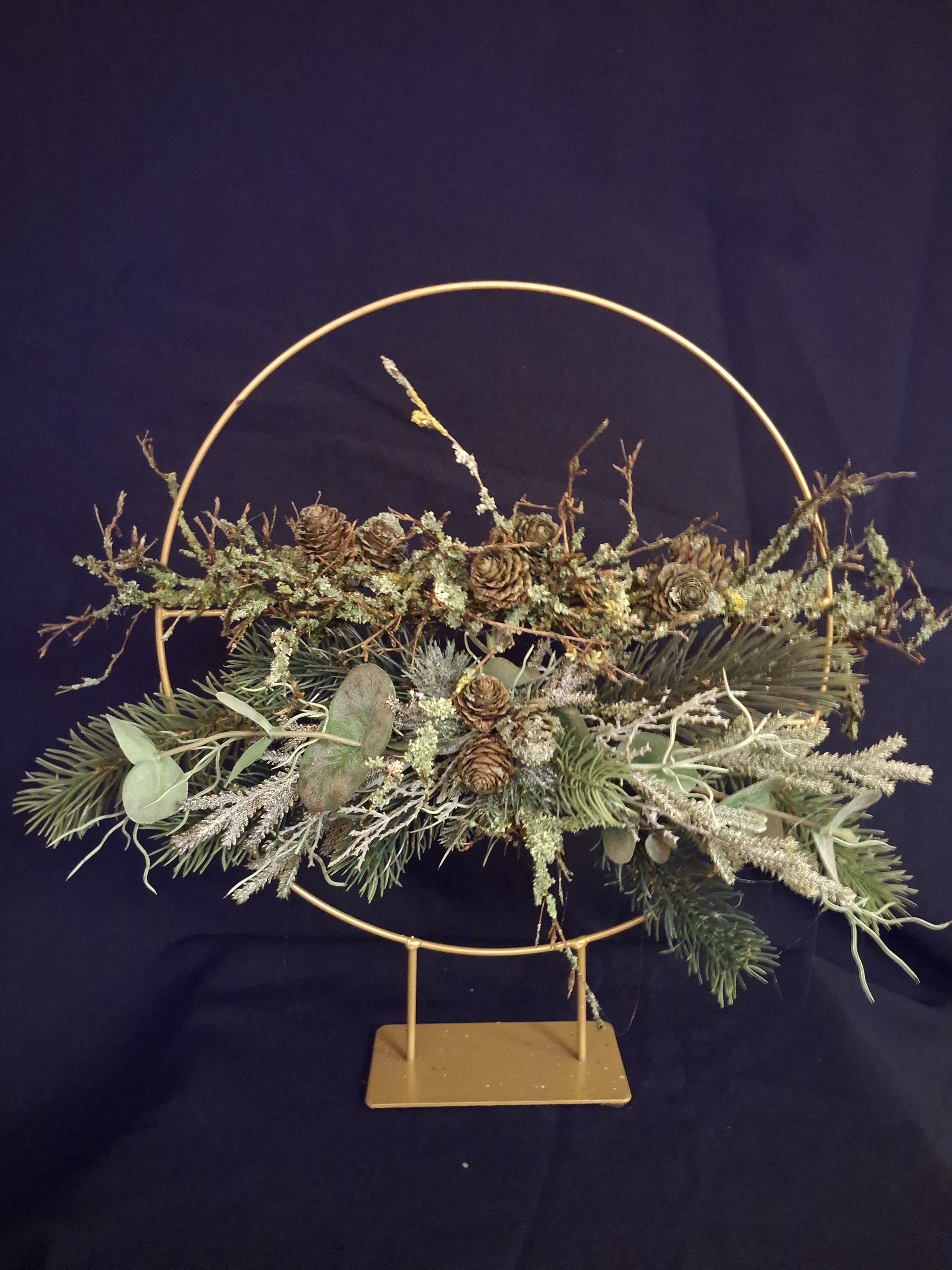 Materiaal: Metalen ring op standaard, kunstgroen, dennenappels, takjes, besjes en winteraccenten