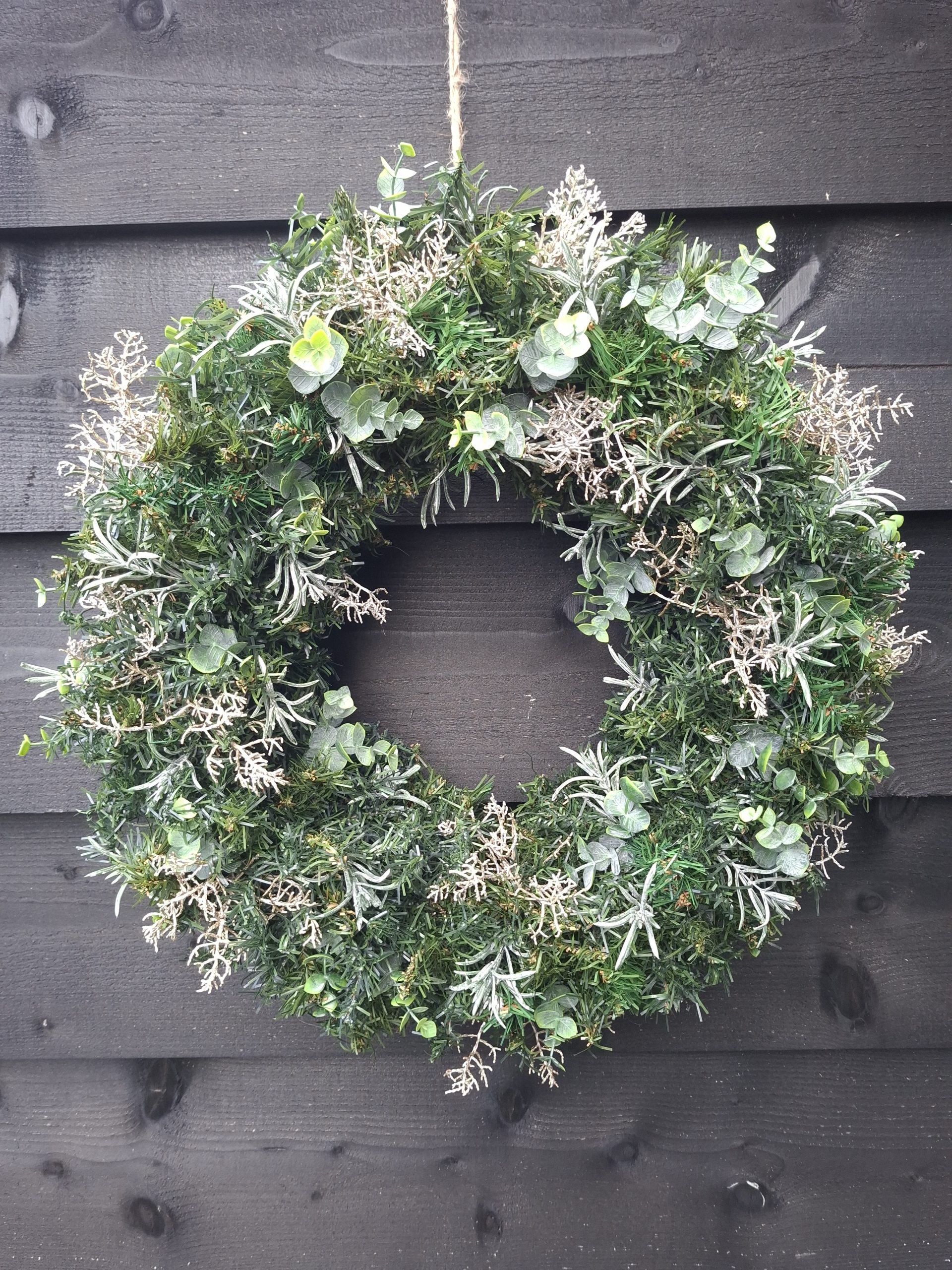 Een volle, handgemaakte krans van diverse soorten groen. De natuurlijke mix van texturen en tinten geeft een rustige, luxe uitstraling — perfect voor aan de deur of in huis.