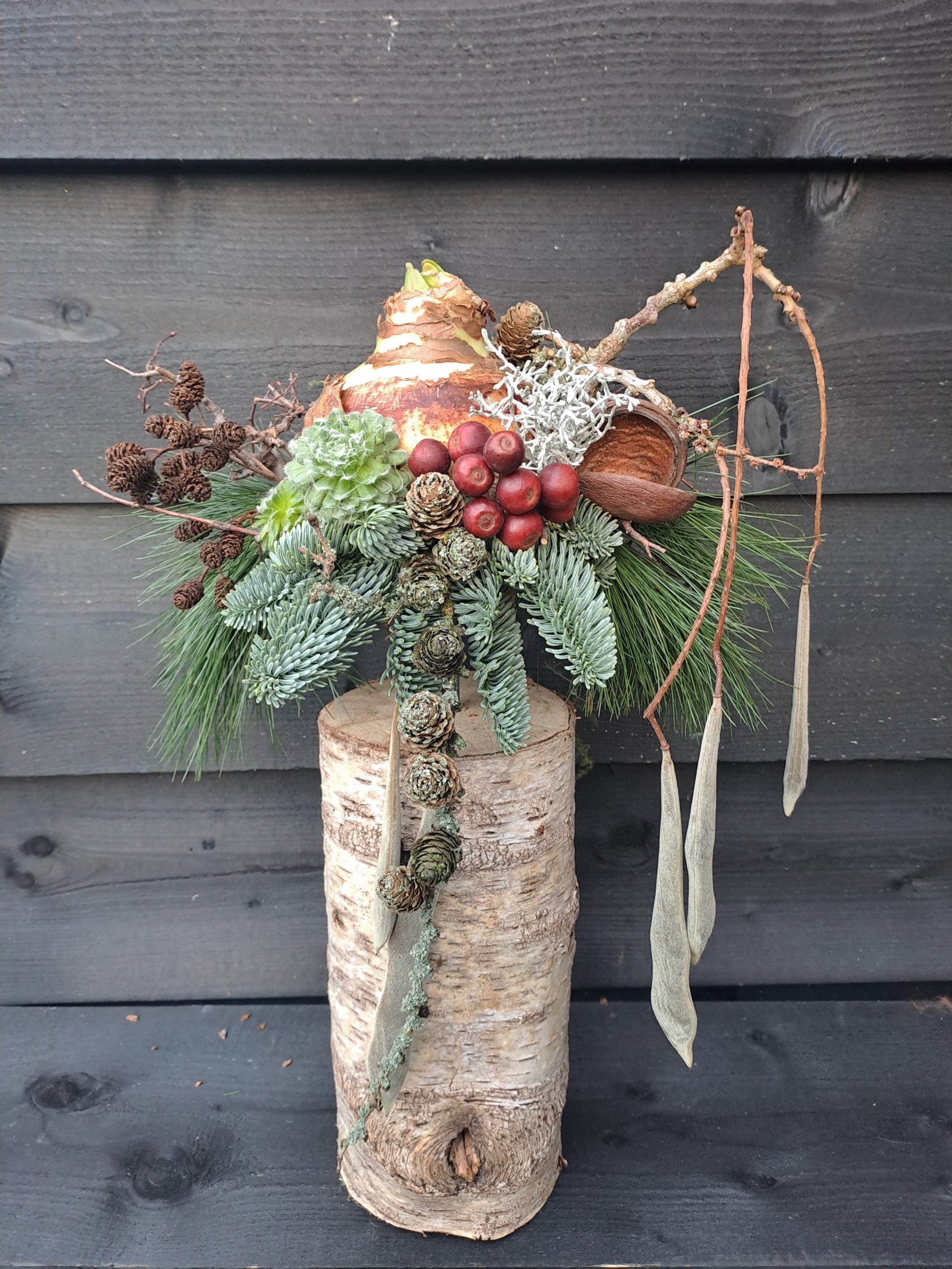Materiaal: Amaryllisbol, wintergroen, bessen, mos, natuurlijke takken, berkenstam
