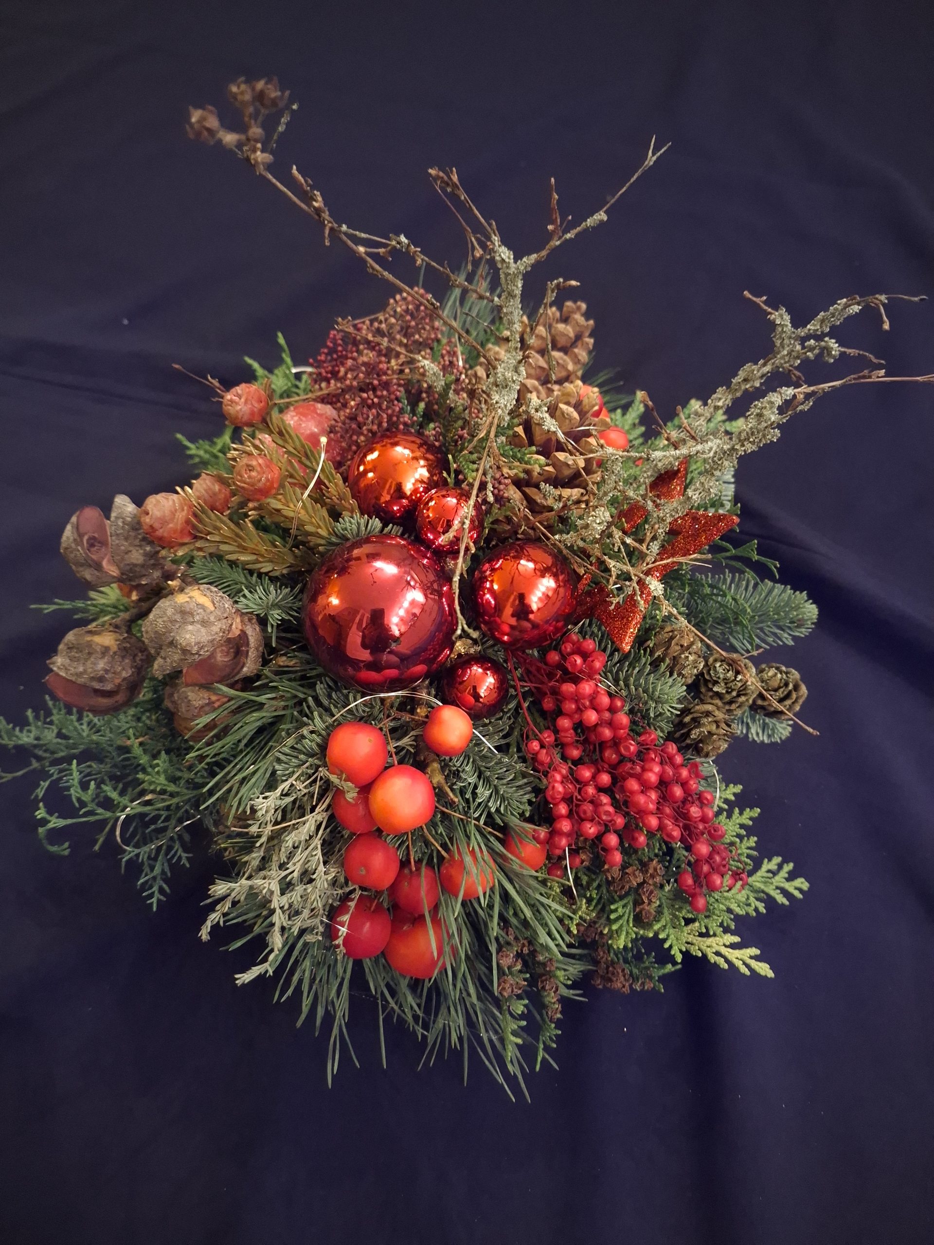 • Materiaal: Wintergroen, rode bessen, dennenappels, takstructuren, glanzende rode kerstballen