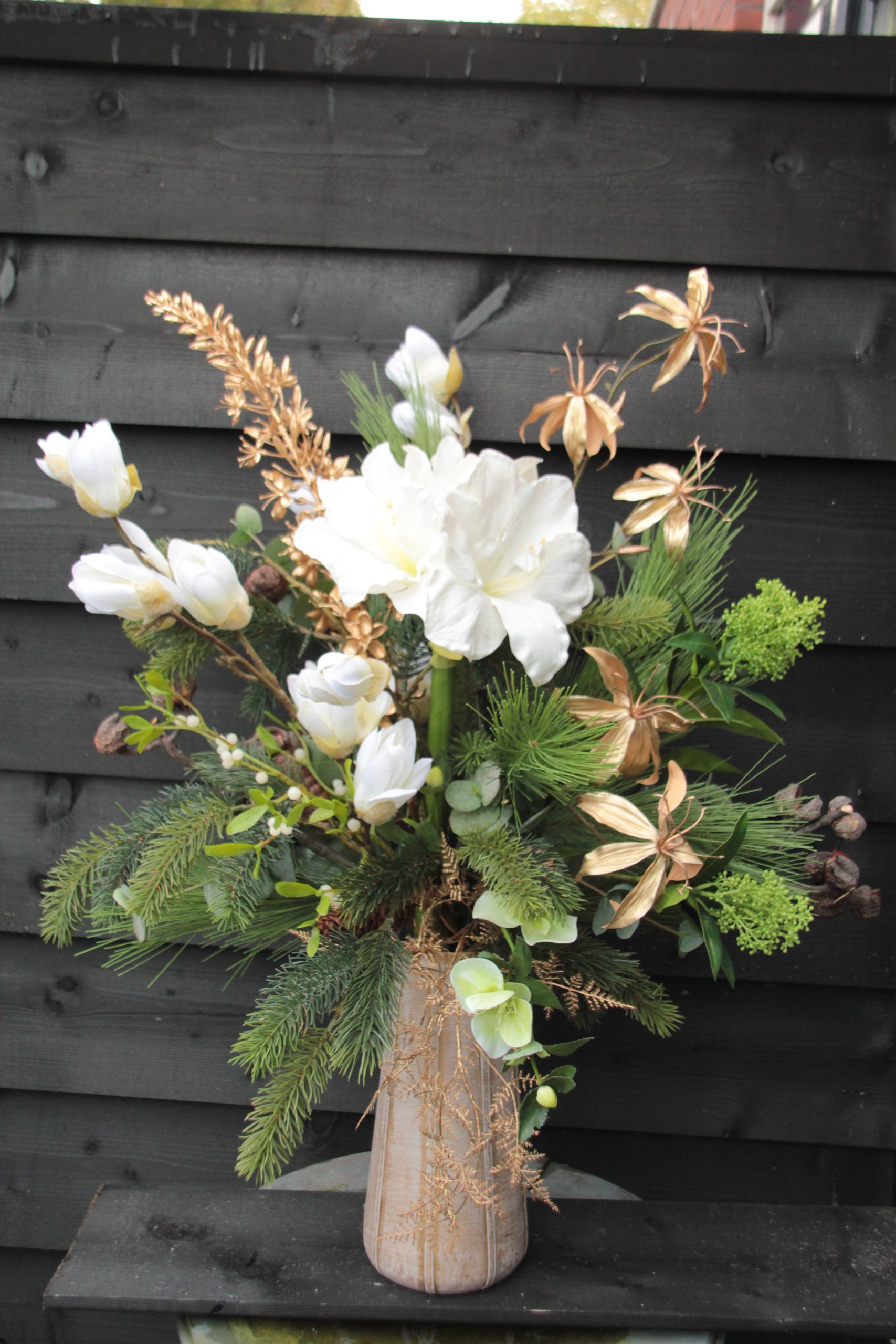 Dit royale winterarrangement brengt direct sfeer en klasse in elke ruimte. De combinatie van volle witte bloemen, wintergroen en subtiel glanzende gouden elementen zorgt voor een harmonieuze mix van frisheid en luxe. Door de variatie in vormen, bladstructuren en hoogtes ontstaat een speels maar elegant geheel dat moeiteloos opvalt.