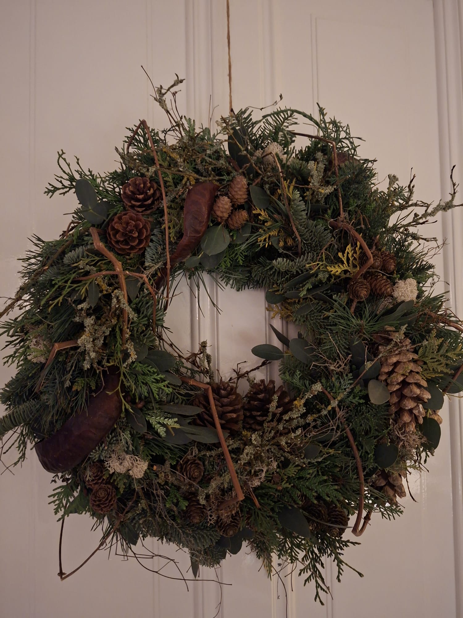Materiaal: Wintergroen, eucalyptus, dennenappels, rode bessen, bonen van de blauwe regen en natuurlijke takjes