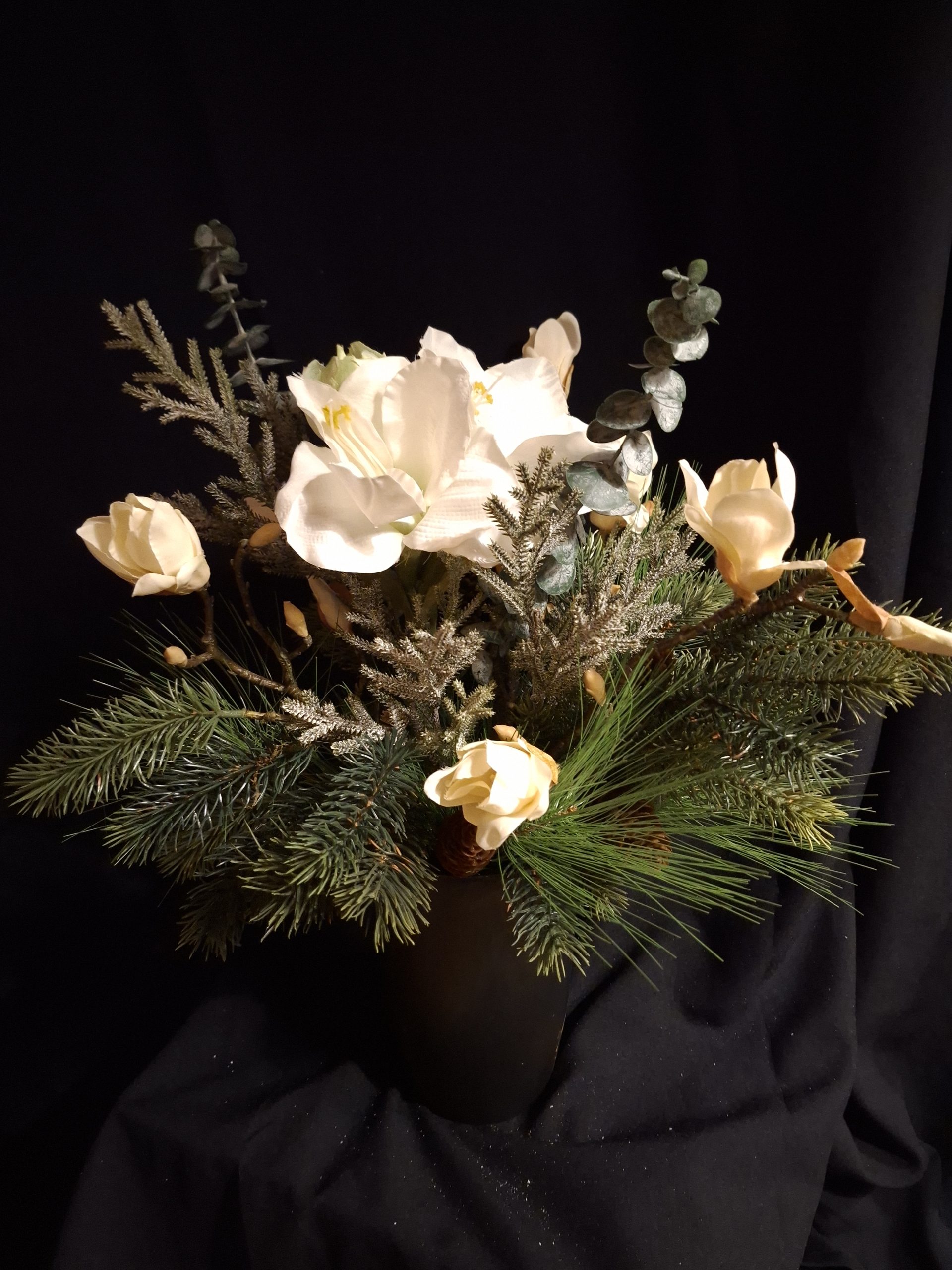 Materiaal: Wintergroen, zilvergroen, kunstbloemen (wit), decoratieve knoppen, matzwarte vaas