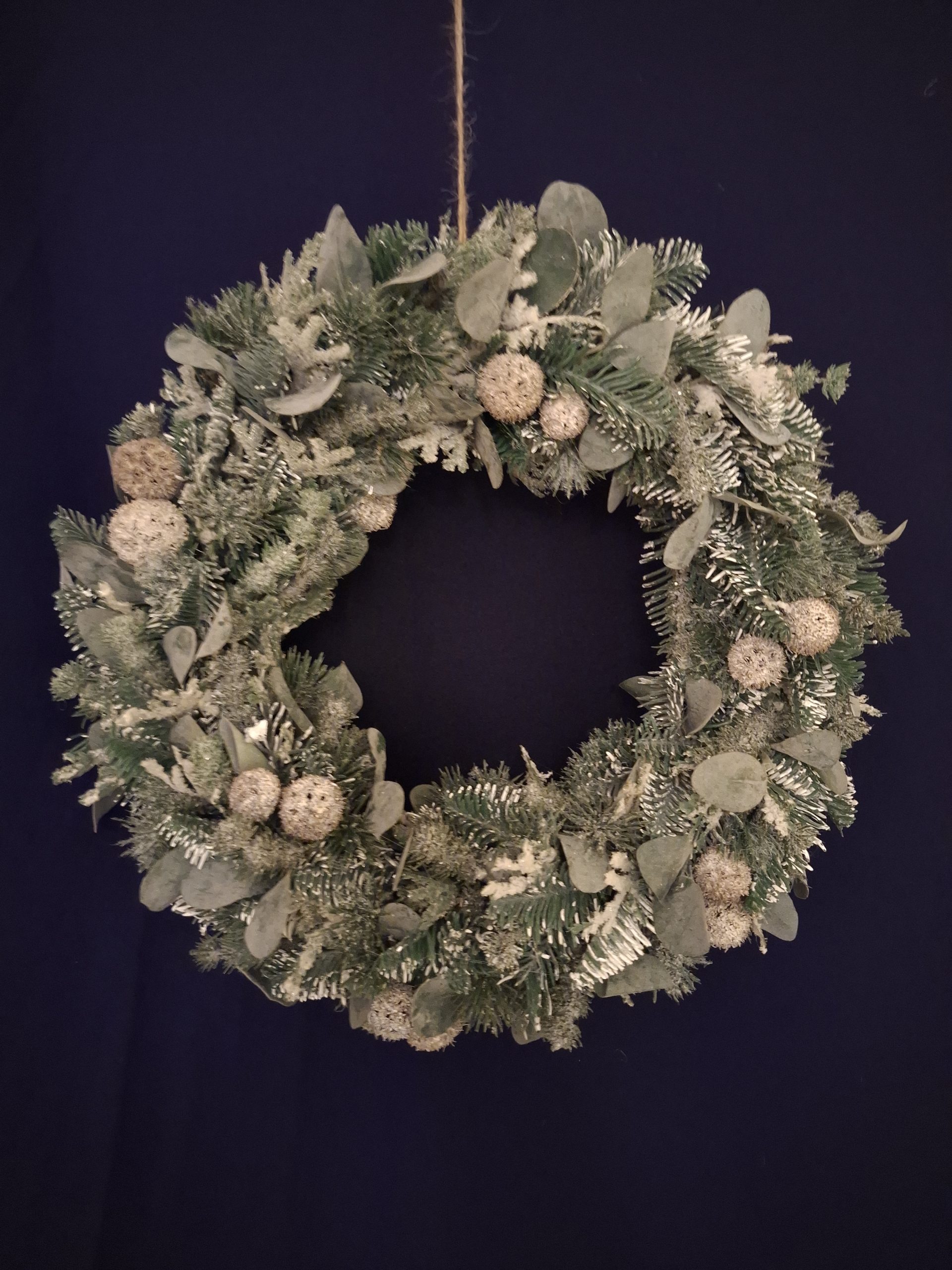Deze stijlvolle winterkrans van 30 cm is met zorg opgemaakt in luxe zijden materialen, waardoor hij jaar na jaar mooi blijft. De combinatie van diep groen naaldwerk, eucalyptusbladeren en zachte sneeuwaccenten geeft de krans een verfijnde, natuurlijke uitstraling. Subtiele goudtint-decoratiebollen zorgen voor een feestelijk gevoel, zonder dat het té druk wordt.